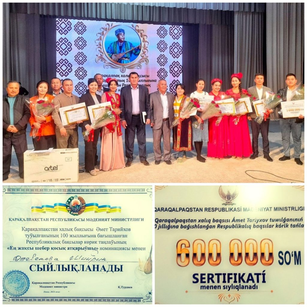 Қарақалпақстан халық бақсысы Әмет Тарийхов туўылғанының 100 жыллығына бағышланған Республикалық көрик таңлаўының «Ең жақсы шебер қосық атқарыўшы» номинациясы менен Нөкис қаласы Әмет бақсы атындағы 12-санлы балалар музыка ҳәм көркем өнер мектеби оқытыўшысы Өтегенова Шийрын сыйлықланды ҳәм 600.000 сўмлық сертификатты қолға киритти.